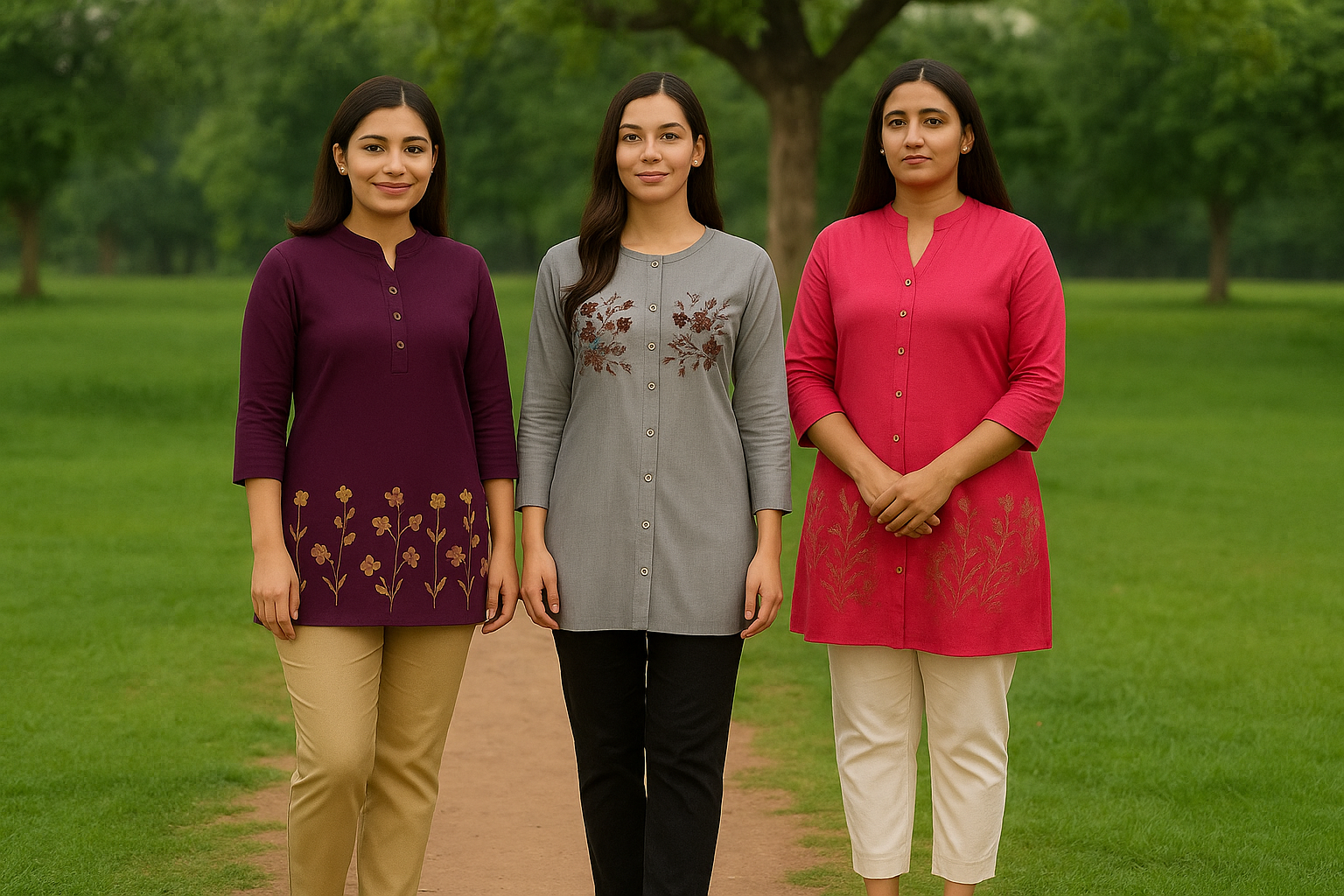 1. Purple Kurti – A straight-fit kurti with three-quarter sleeves, featuring delicate floral embroidery along the hemline for a charming touch.